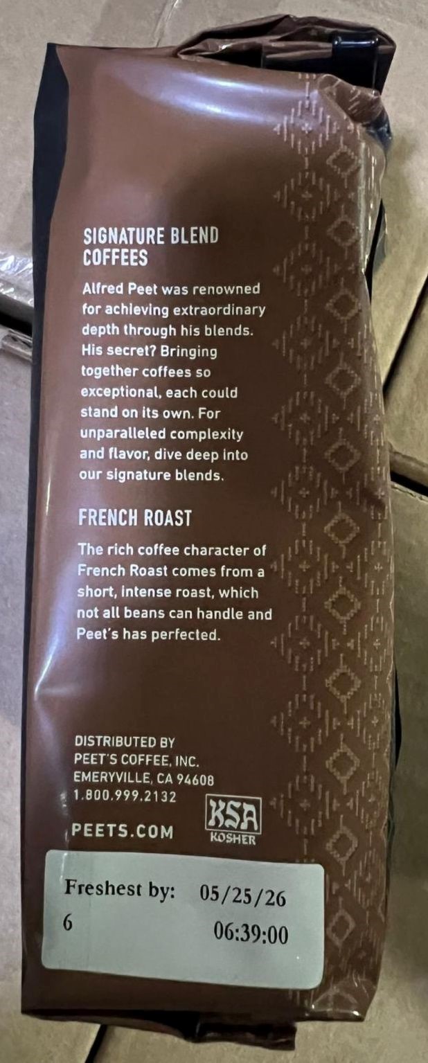 Peet’s CoffeeFrench Roast Dark Roast10.5ozGround CoffeeExp: 05/25/26Total: 4 500 packsPrice take all: 8.95$ per packFOB: LA, USA