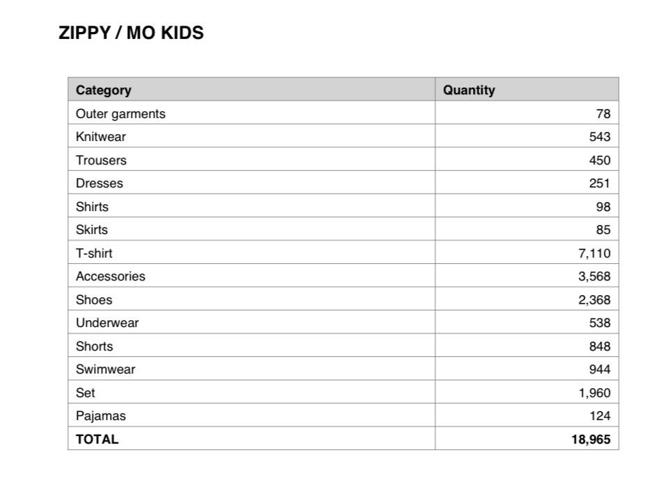Total: 18 965 pieces of Zippy brand children's clothing